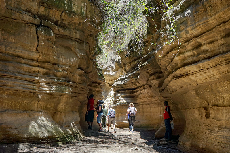 Walk into Hell’s Gate Gorge, famous for its narrow canyons, hot springs, and red rock cliffs.
